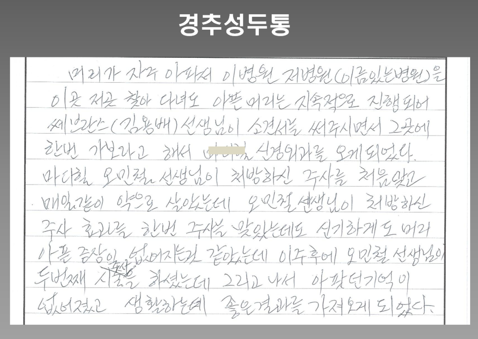 경추성두통 프롤로 치료 경추성두통은 목의 근육이 뭉침과 긴장으로 인해 발생하는 두통을 말합니다. 이러한 현상은 잘못된 자세, 스트레스, 과다한 화면 시간