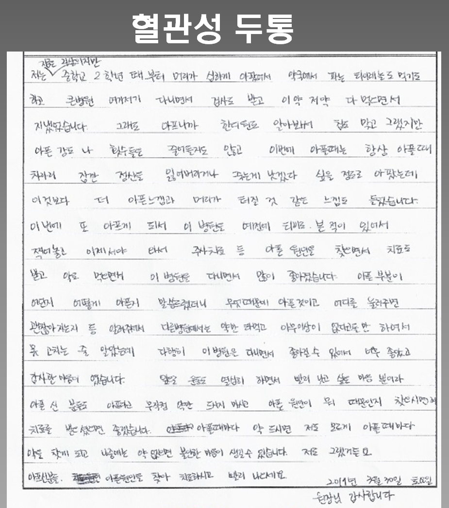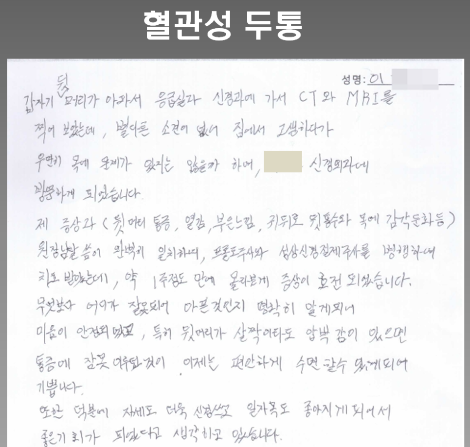 혈관성두통, 프롤로치료 + 성상신경차단술 혈관성두통은 혈관 운동성 두통으로도 알려진 신체 활동에 의해 유발되는 두통의 한 종류이다. 이러한 두통은 일상 생활에서